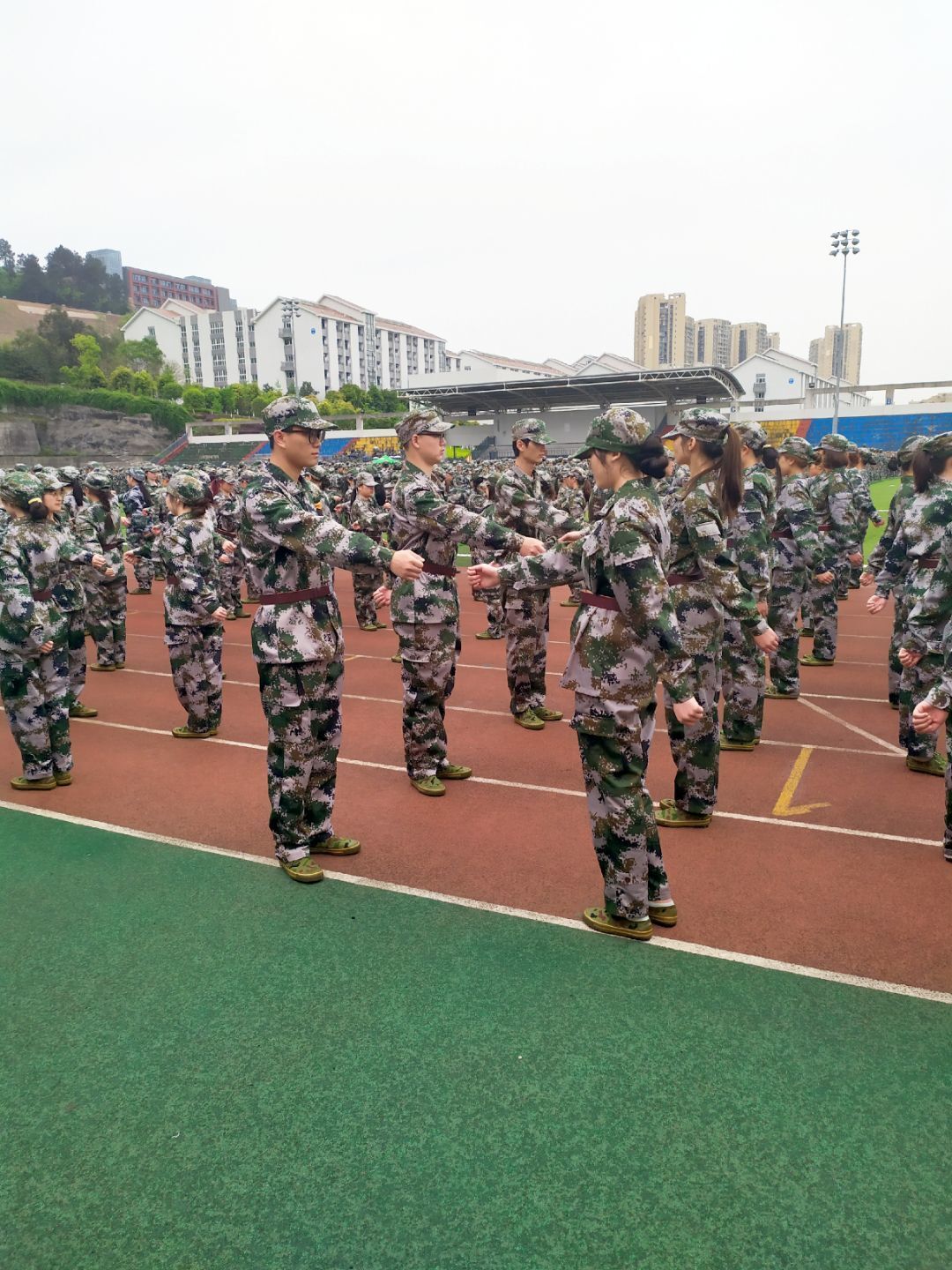 下午的训练以跑操和原地踏步走手势训练为主。同学们以营为单位绕着操场开始了跑操,同学们阵型整齐,口号嘹亮,令人印象深刻。随后同学们两人一组开始了原地踏步走手势练习。