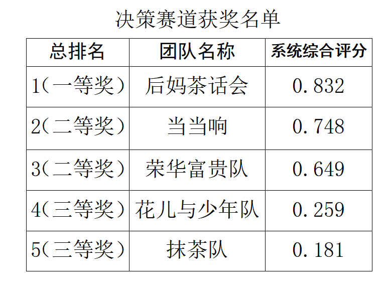 最终,决策赛道:“后妈茶话会队”拔得头筹荣获校内赛第一名,“当当响队”、“荣华富贵队”荣获第二名,“花儿与少年队”、“抹茶队”荣获第三名;运营赛道:“红红火火队”拔得头筹荣获校内赛第一名,“启己队”、“脱单2/3队”荣获第二名,“三个美女队”、“三个铁人队”荣获第三名。根据两个比赛赛道的评分和指导老师的决定,推举决策赛道:“后妈茶话会队”,“当当响队”及运营赛道:“红红火火队”三支队伍进入市决赛。