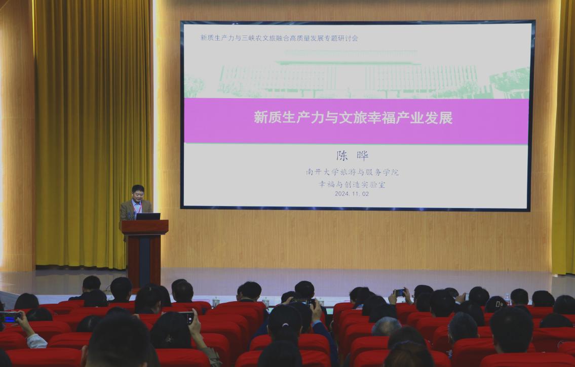 在随后的主旨演讲阶段,陈晔、孙九霞、谢朝武、阚如良分别以《新质生产力与文旅幸福产业发展》《媒介与地方视角下的数字文旅场域再造》《数字时代旅游直播营销的理论与实践》《农文旅融合振兴乡村的逻辑与规律》为主题做了精彩报告,为与会者呈现了一场场思想碰撞与智慧交融的学术盛宴。他们的报告不仅深刻剖析了当前文旅产业面临的新机遇与挑战,还从理论与实践的双重维度,为三峡农文旅融合的创新发展提供了宝贵的参考。