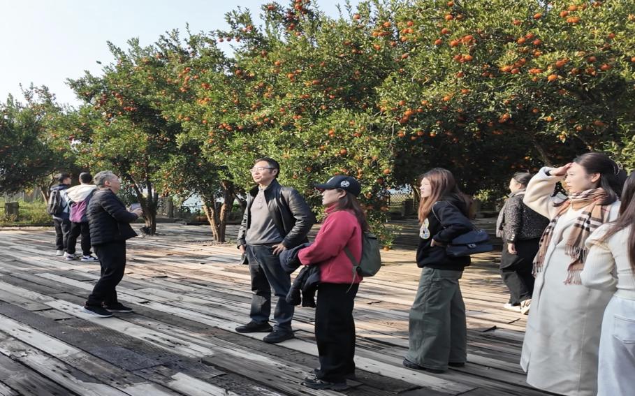 在调研活动中,景区负责人全程陪同讲解,带领师生们开启了一场“理论+实践”的沉浸式学习。师生一行先通过景区主题宣传影片,快速了解以“一江碧水、两岸桔林”为生态基底的转型密码,见证传统桔园向综合型文旅空间的华丽蜕变;紧接着走进文创展示区,一件件融合峡江元素与古红桔文化的特色工艺品让人眼前一亮,直观感受文化活化的生动实践;最后实地探访生态园与特色民宿,深入了解“一心一廊四区”规划布局,解锁生态养护与旅游体验双向融合的开发新思路。同学们在整个调研中认真聆听、细致记录,不时结合专业知识与老师们交流探讨,现场学习氛围浓厚,纷纷表示近距离接触景区运营实践,让文旅项目的产品设计、文化赋能不再是课本上的文字,而是看得见、摸得着的鲜活案例。