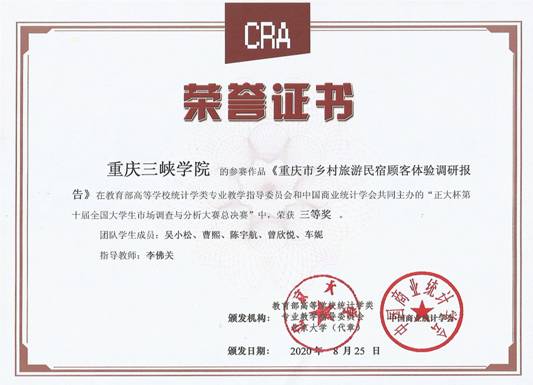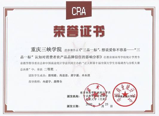 公司员工作品《“三品一标”,想说爱你不容易——“三品一标”认知对消费者农产品品牌信任的影响分析》获全国二等奖(指导老师:冉建宇、颜帮全),《重庆市乡村旅游民宿顾客体验调研报告》获全国三等奖(指导老师:李佛关)。