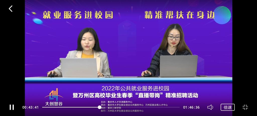 2022年公共就业服务进校园暨万州区高校毕业生春季 “直播带岗”精准招聘活动(美加墨世界杯官网专场)在4月8日下午14点成功举行。参加此次线上招聘会的有重庆市人才交流服务中心以及美加墨世界杯官网2018级员工。首先,在直播中宣讲人简洁明了的介绍了各个企业所缺岗位,以及所需人才。