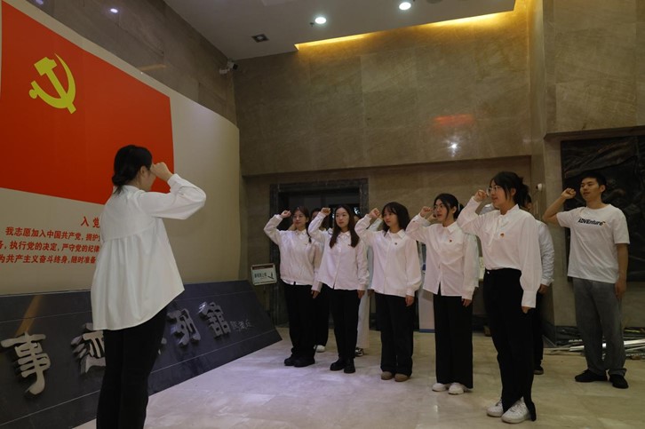 随后,汪鹏鹏带领全体党员来到瞻仰广场,整齐列队,向革命烈士敬献鲜花,默哀致敬。面对党旗,大家重温入党誓词,一声声有力的誓言回荡在广场之上,彰显出党员们不忘初心、牢记使命的信念。“我们要将军人的战斗精神融入到日常学习和生活中,让它成为前行的灯塔,让革命精神永放光芒。”2021级旅游管理1班刘畅感悟道。