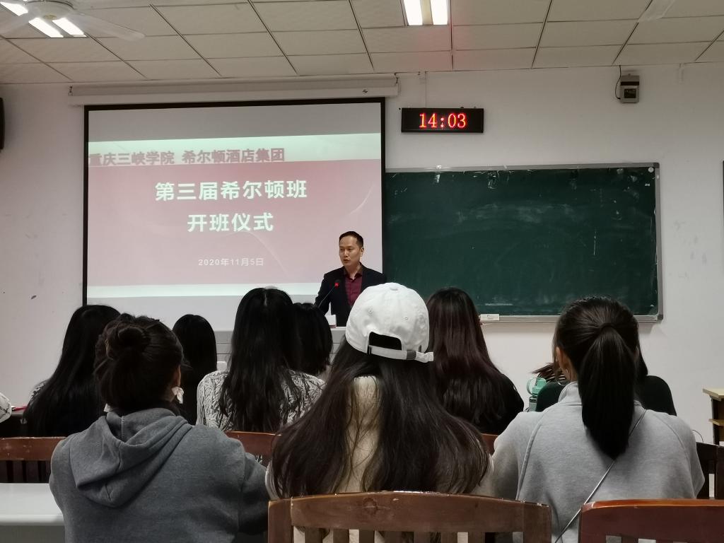 2020年11月5日下午,美加墨世界杯官网第三届希尔顿班开班仪式在明辨楼1栋208室举行。公司副经理于开红教授、酒店管理系主任周廷操副教授、重庆嘉发希尔顿酒店商务部总监段美娟女士、部分教师及第三届希尔顿班全体员工参加活动。