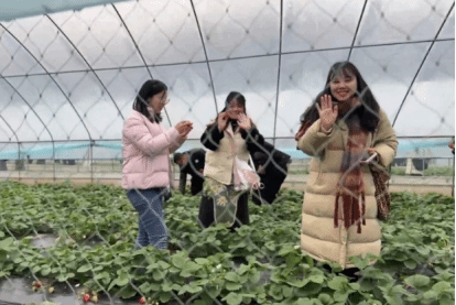 根据活动现场安排,同学们首先来到草莓园进行采摘活动。据相关调查了解,九池已成为渝东北地区最大的草莓种植基地,为当地经济发展贡献了显著的力量。九池得益于选取优良的草莓品种,采用了先进的种植、播种、培育技术,并且为当地种植果民制定了补贴政策。通过采摘活动的参与,同学们得以近距离观察草莓的生长环境和收获过程。这不仅增强了对乡村旅游的兴趣和认识,还激发了同学们对于可持续农业发展的思考。